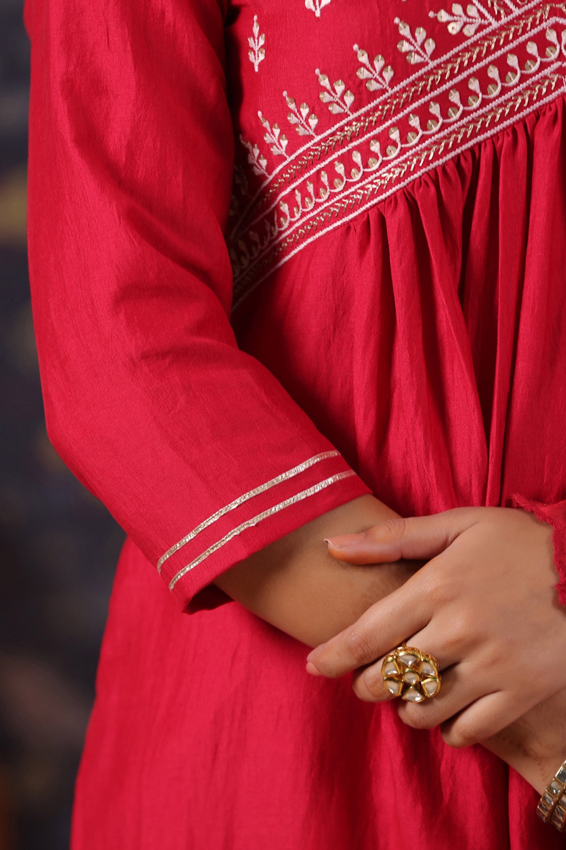 Red Cotton Silk Embroidered Alia-Cut Kurta, with Pant & Dupatta