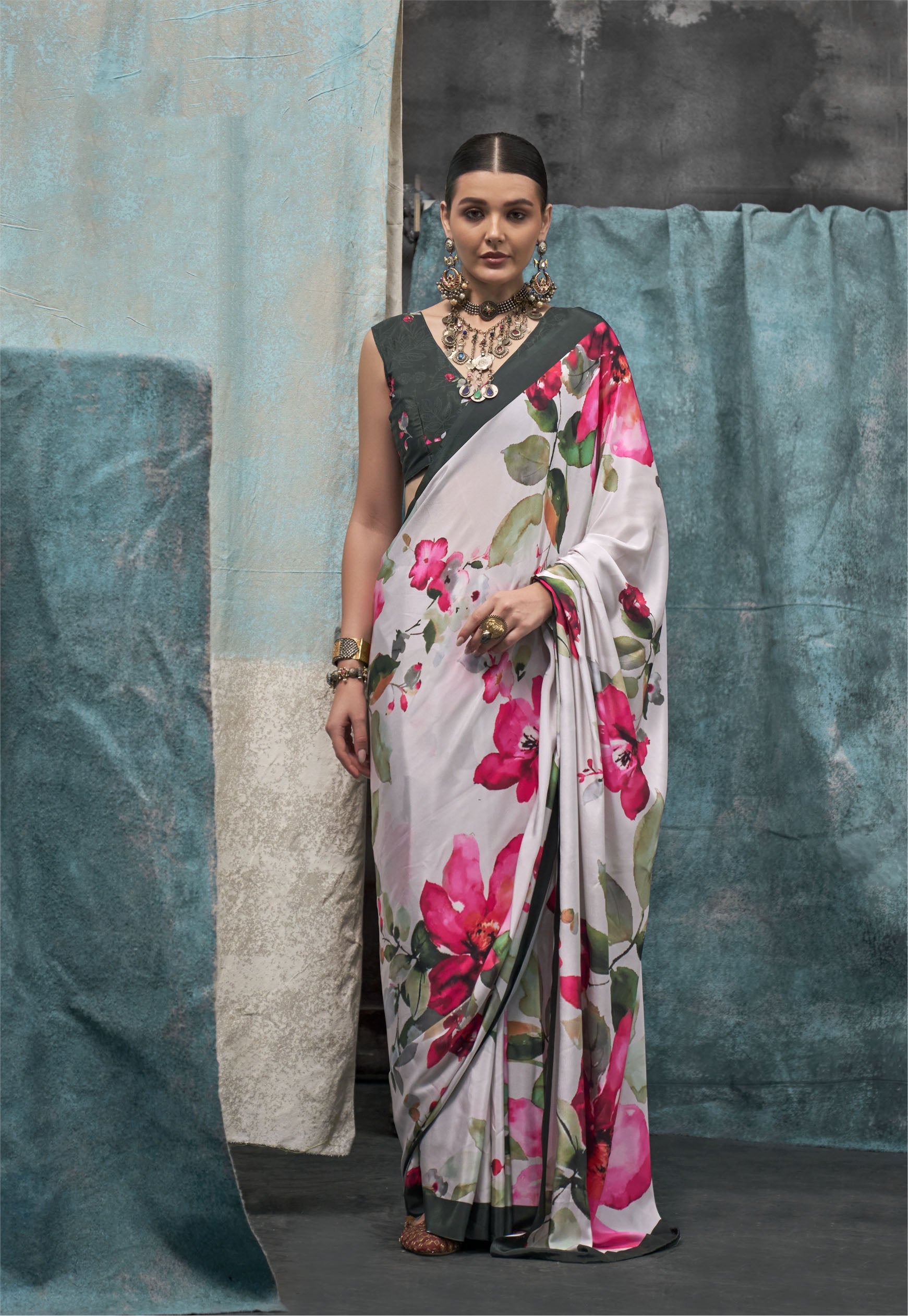 Description : Elevate your ethnic wardrobe with this luxurious Satin Silk Printed Saree, designed to make a statement at every occasion. Crafted from high-quality satin silk, this saree drapes gracefully, exuding a soft sheen and rich texture that feels as elegant as it looks. The intricate prints add a touch of contemporary style, blending traditional charm with modern aesthetics. Ideal for weddings, festive celebrations, and special gatherings, this saree comes with a matching blouse piece, allowing you to customize the look to your style.