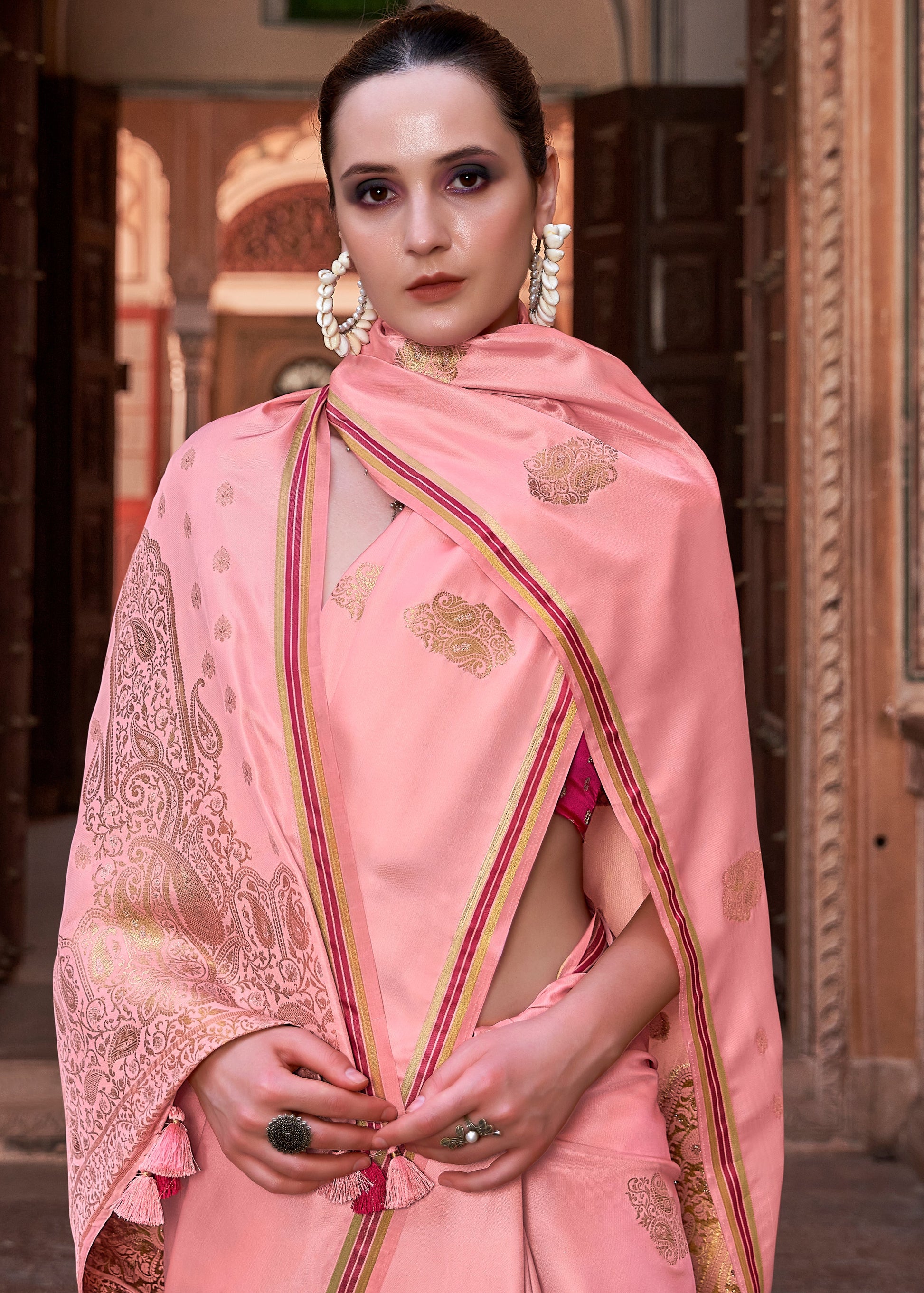 Carrot Pink Pure Satin Saree with Zari Weaving Border and Unstitched Blouse Piece