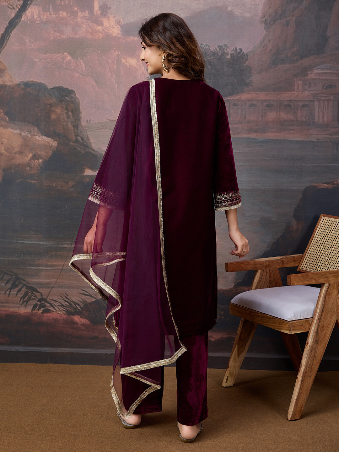 Velvet Embroidered V-Neck Kurta, Pant and Dupatta Set