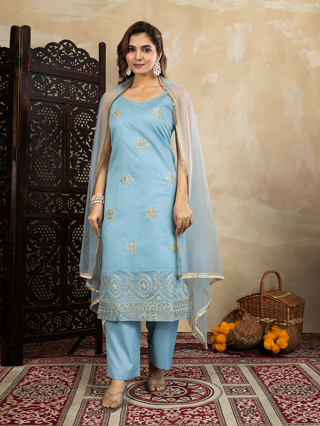 Silk Blend Sky Blue Embroidered Straight Kurta Set with Net Dupatta
