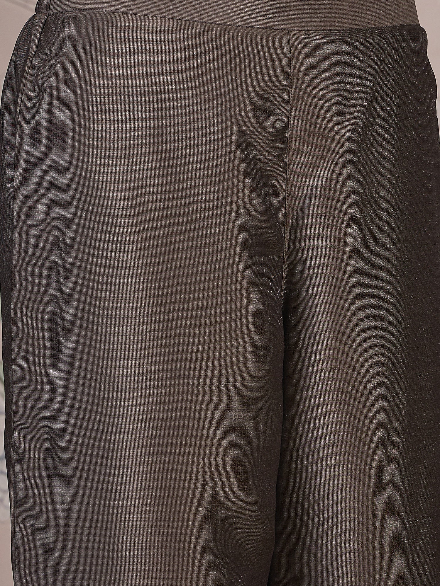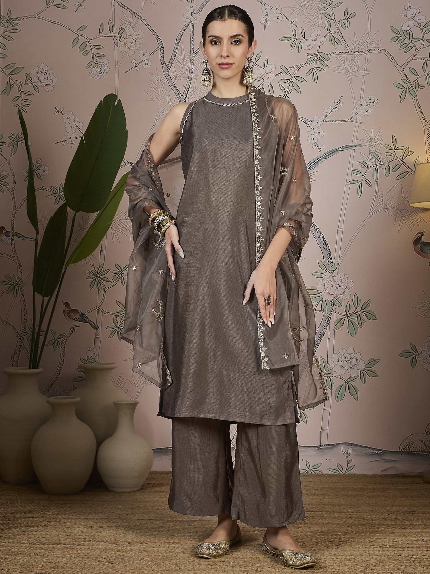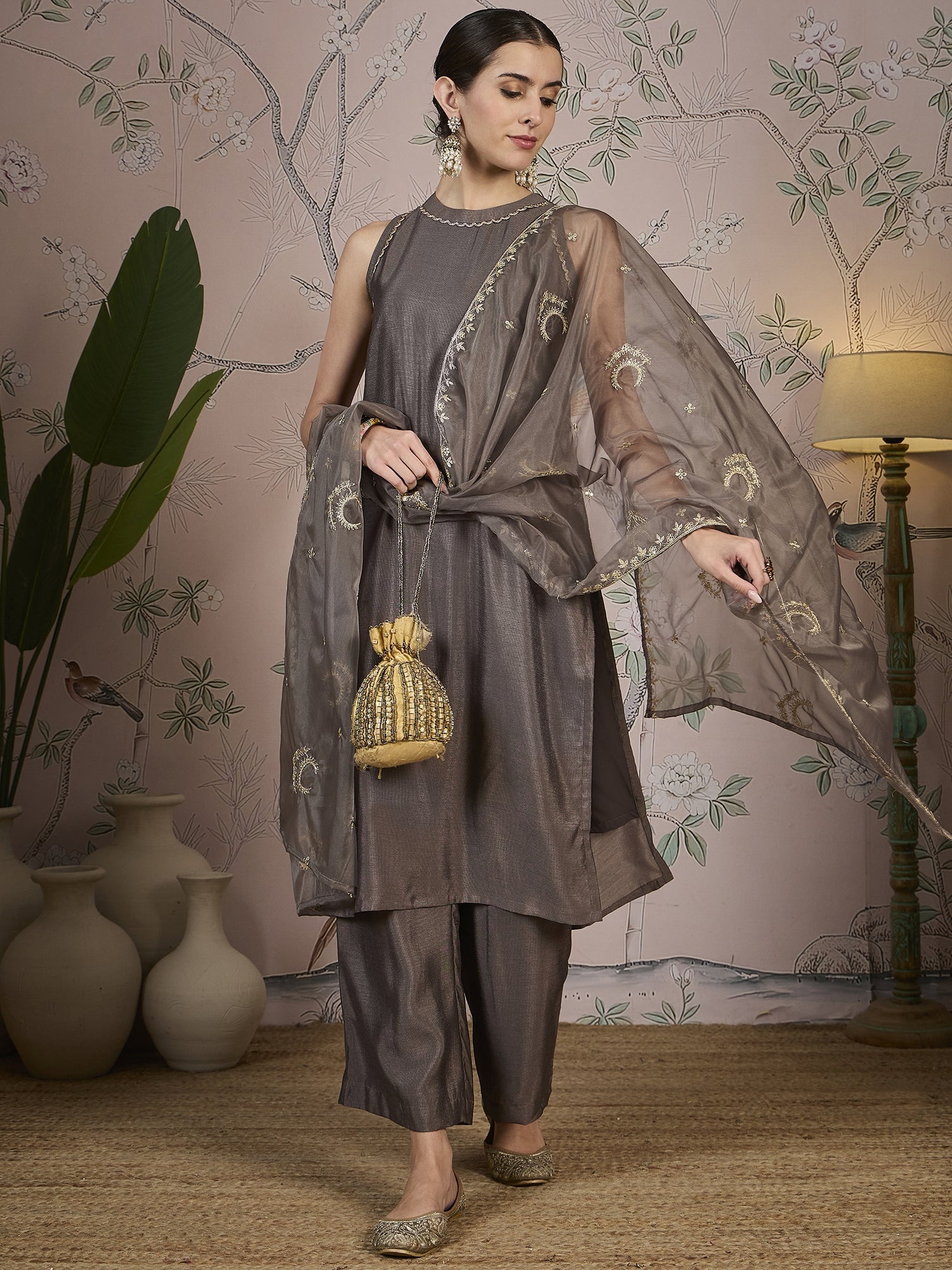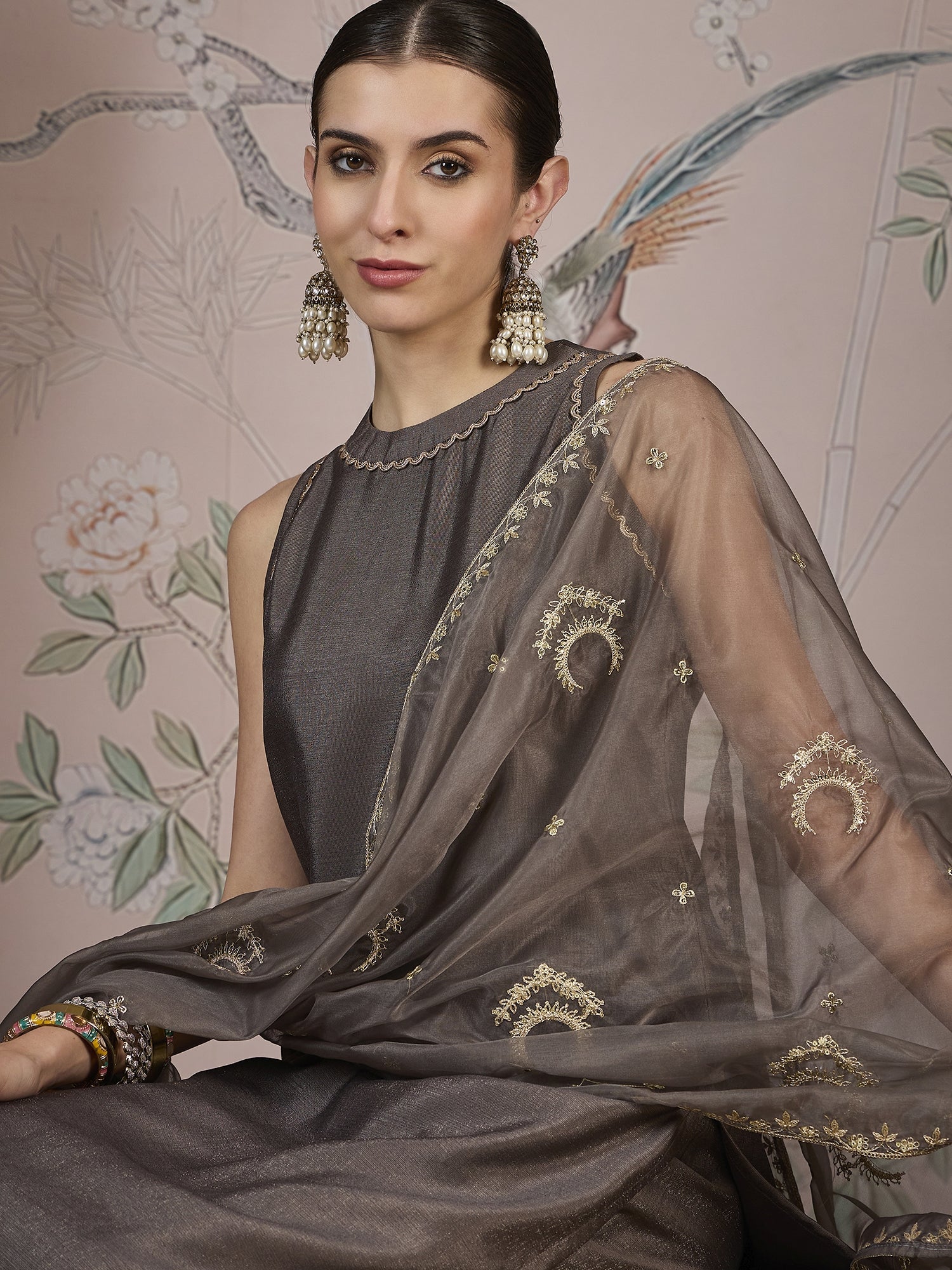 Taupe Bronze Silk Blend Kurta, Pant and Organaza Dupatta Set